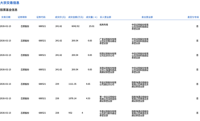 2月13日,芯原股份大宗交易成交40.68万股,成交额9786.03万元,占当日总成交额的1.77%,成交均价 240.56元,较市场收盘价275.5元折价12.68%,其中最高成交价241.62元,最低成交价238元。 | 交易日期 | 证券調称 | 证券代码 | | | 成交价(元) 成交金额(万元) 成交量(*) 买入营业部 | | 美出雪变超 | 是否为专场 | | --- | --- | --- | --- | --- | --- | --- | --- | --- | | 2026-02-13 | 芯颜般份 | 688521 | 241.62 | 6042.92 | 25.01 | 机构专用 | 不断的有限公司 | KA | | 2026-02-13 | 芯原般份 | 688521 | 241.62 | 200.54 | 0.83 | PATER 最品牌费 | 公司管理材料图语 | Ka | | 2026-02-13 | 芯原般份 | 688521 | 241.62 | 200.54 | 0.83 | 是什么意思想 | 名自学到材质量语 | 절 | | 2026-02-13 | 芯原层份 | 68 ...