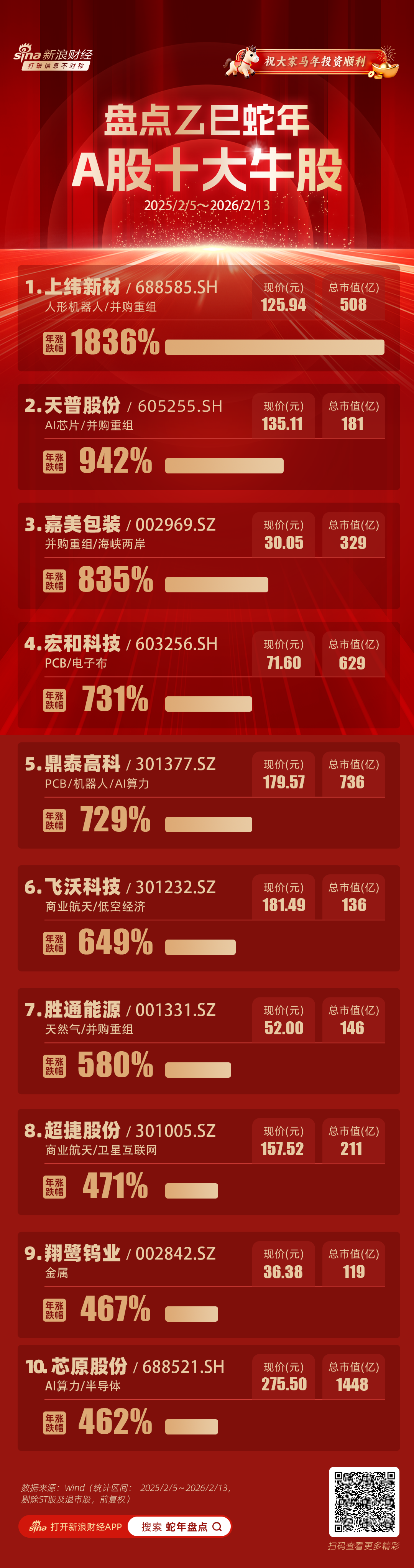 2月13日,农历蛇年最后一个交易日收盘,蛇年A股十大牛股名单出炉:农历蛇年期间,A股涨幅最高个股为上纬新材,累计涨幅高达18倍以上;天普股份 大涨942%,嘉美包装大涨835%。蛇年共诞生5倍股7只,10倍股1只。 4. 云和科技 / 603256.SH 现价(元) 总市值(亿) PCB/电子布 71.60 629 781% 5.鼎泰高科 / 301377.SZ 总市值(亿) 现价(元) 179.57 736 PCB/机器人/AI算力 729% 6.飞沃科技 / 301232.SZ 总市值(亿) 现价(元) 136 181.49 商业航天/低空经济 649% 7.胜通能源 / 001331.SZ 现价(元) 总市值(亿) 146 52.00 天然气/并购重组 F80% 8.超捷股份 / 301005.SZ 总市值(亿) 现价(元) 211 157.52 商业航天/卫星互联网 年涨 联唱 9.翔鹭钨业 / 002842.SZ 现价(元) 总市值(亿) 119 36.38 金属 467% 10. 芯原股份 / 688521.SH 现价(元) 总市值(亿) 275.50 1448 AI算力/半导体 462% 数据来 ...