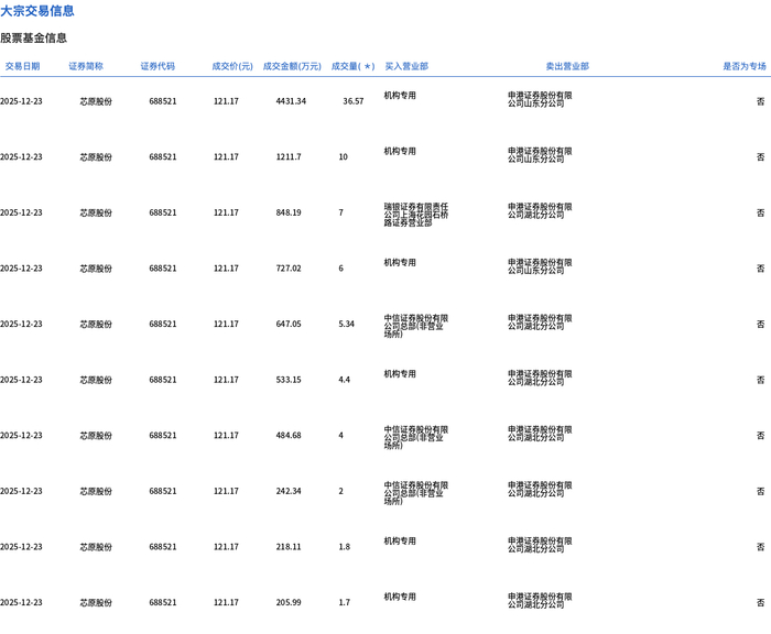 | 交易日期 | 证券简称 | 证券代码 | | | 成交价(元) 成交金额(万元) 成交量(*) 买入营业部 | | 类出营业部 | 是否为专场 | | --- | --- | --- | --- | --- | --- | --- | --- | --- | | 2025-12-23 | 芯原般份 | 688521 | 121.17 | 4431.34 | 36.57 | 机构专用 | 公司出案务公司员 | Ki | | 2025-12-23 | 芯原层份 | 688521 | 121.17 | 1211.7 | 10 | 机构专用 | 表副出秦男女為 | Kat | | 2025-12-23 | 芯原股份 | 688521 | 121.17 | 848.19 | 7 | 중 기본 중 100원 | 去問題我男女育聞 | 문 | | 2025-12-23 | 芯原般份 | 688521 | 121.17 | 727.02 | ୧ | 机构专用 | 表否还索努您有限 | KA | | 2025-12-23 | 芯质服份 | 688521 | 121.17 | 647.05 | 5.34 | รีย์คริส ...