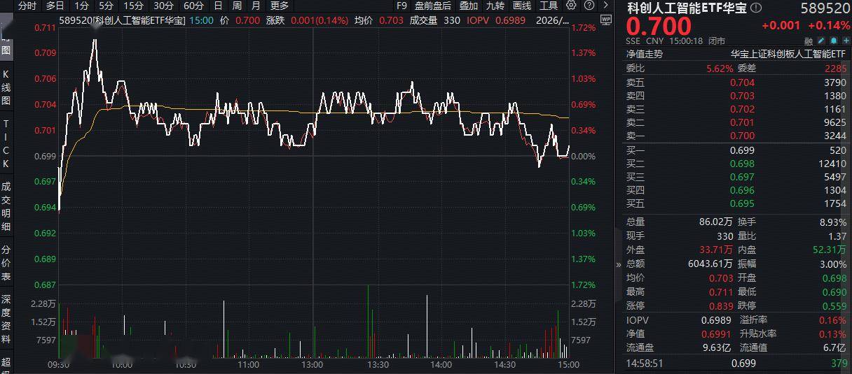 【国产替代之光,科创自立自强】 科创人工智能ETF华宝(589520)及其联接基金(联接A:024560,联接C:024561)重点布局国产AI产业链,成份股囊括国产GPU龙头(如寒武纪),国 产ASIC龙头(如芯原股份)、AI应用龙头(如金山办公),半导体行业权重占比近一半,具备较强进攻性;软件行业权重占比超三成,有望受益于AI应用 补涨行情。同时,该ETF是融资融券标的,是一键布局国产算力的高效工具。 无惧美股科技股行情波动,2月13日,重点布局国产AI产业链的科创人工智能ETF(589520)场内涨幅早盘上探1.72%,后虽被大盘拖累,但仍逆市收涨 0.14%,全天成交额6043万元,环比小幅放量。 成份股方面,星环科技领涨超9%,云天励飞、奇安信等个股跟涨,芯原股份涨超2%,股价再创历史新高。 产业层面,临近春节AI红包大战,国产大模型密集上新,智谱GLM-5火爆全球,马斯克评论字节视频模型Seedance2.0表示,模型发展速度太快。往后看, DeepSeek V4大模型、阿里巴巴Qwen 3.5等有望在2月中旬推出,国产大模型或迎来下一波AI高潮。 政策层面,国资委近日成立央企"AI+"具身智能产 ...