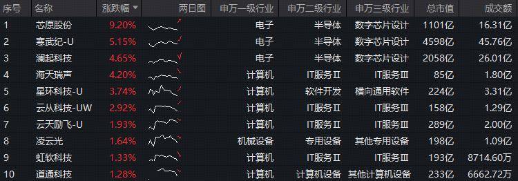 | 序号 | 名称 | 涨跌幅 | 两日图 | 申万一级行业 | 申万二级行业 | 申万三级行业 | 总市值 | 成交额 | | --- | --- | --- | --- | --- | --- | --- | --- | --- | | | 芯原股份 | 9.20% | | 电子 | *** | 数字芯片设计 | 1101亿 | 16.31亿 | | 2 | 寒武纪-U | 5.15% | an | 电子 | 老师法 | 数字芯片设计 | 4598亿 | 45.76亿 | | 4 4 | 湖起科技 | 4.65% | www | 电子 | 林島市 | 数字芯片设计 | 2058亿 | 26.01亿 | | | 旭浩风奥 | 4.20% | www | 计算机 | IT服务II | IT服务Ⅲ | 858 | 1.80亿 | | 5 | 星环科技-U | 3.74% | whil | 计算机 | 软件开发 | 横向通用软件 | 224亿 | 3.31亿 | | 6 | 云从科技-UW | 2.92% | A 1 1 1 | 计算机 | IT服务II | IT服务Ⅲ | 158亿 | 1.29亿 | | 7 ...