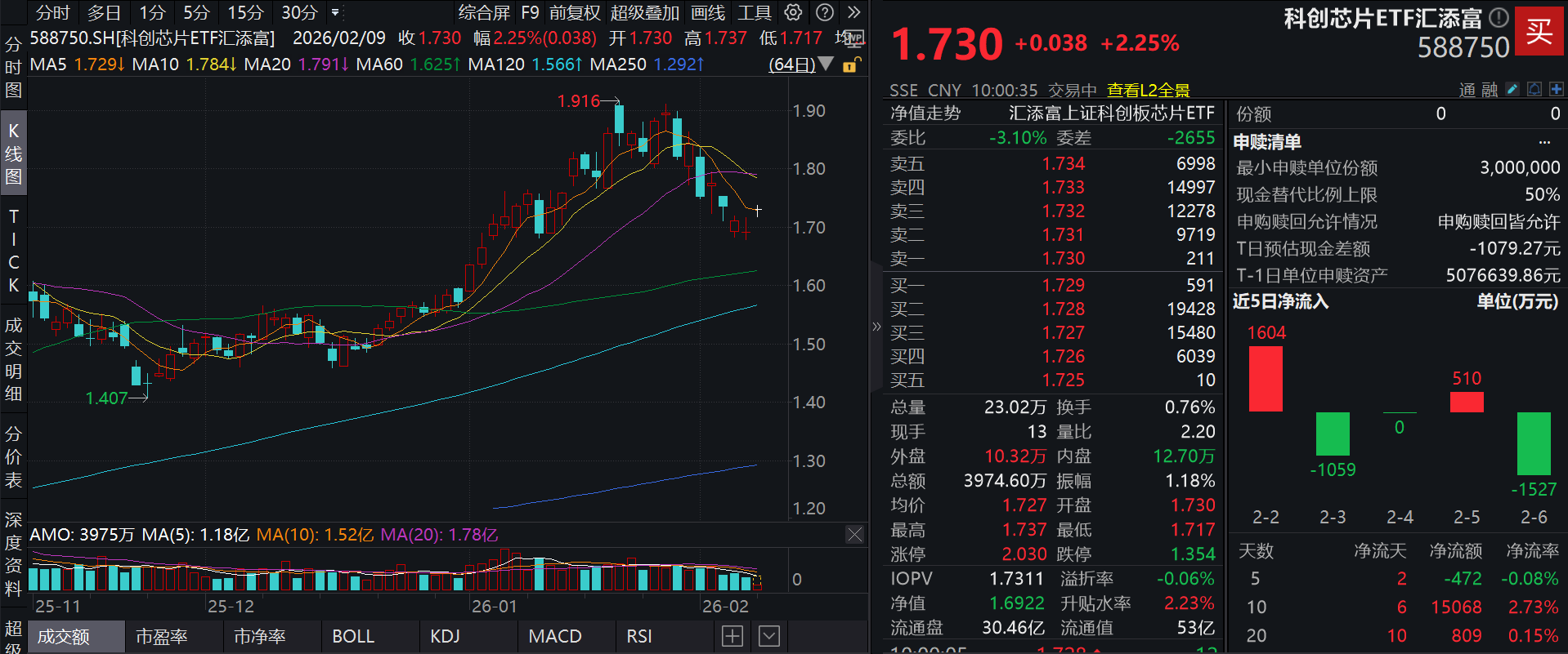 流动性方面,科创芯片ETF汇添富盘中换手0.76%,成交3974.60万元。拉长时间看,截至2月6日,科创芯片ETF汇添富近1月日均成交1.98亿元,排名可比基 金前3。 规模方面,科创芯片ETF汇添富最新规模达51.55亿元,位居可比基金2/11。(数据来源:Wind) 份额方面,科创芯片ETF汇添富近半年份额增长14.22亿份,实现显著增长,新增份额位居可比基金2/11。(数据来源:Wind) 资金流入方面,科创芯片ETF汇添富最新资金净流出1527.31万元。拉长时间看,近10个交易日内有6日资金净流入,合计"吸金"1.51亿元,日均净流入达 1506.77万元。(数据来源:Wind) 数据显示,杠杆资金持续布局中。科创芯片ETF汇添富最新融资买入额达581.03万元,最新融资余额达6394.57万元。(数据来源:Wind) 当地时间上周五(2月6日),美股存储芯片概念集体大涨,周三暴跌出现的失地被收复过半。成分股泰瑞达收涨10.69%,西部数据涨8.61%,希捷科技涨 5.89%,Sandisk涨3.77%,美光科技涨3.08%。 截至2026年2月9日 10:00,上证科创板芯片指数(000685) ...