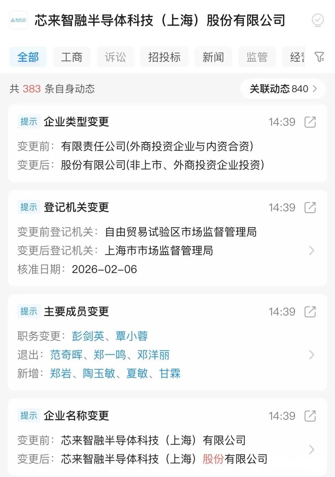 具体来看,2026年2月6日,芯来智融集中完成多项重大工商调整:不仅变更了企业名称,更核心的是将企业类型从有限责任公司变更为非上市股份有限公 司(即业内俗称的"股改"),同时完成登记机关升级至上海市市场监督管理局、核心管理团队成员调整等事宜。值得注意的是,股改作为企业登陆资本市 场的核心前置环节,叠加此前芯原股份收购终止的背景,难免让市场对芯来智融筹备独立上市的可能性产生诸多猜测。 芯来智融半导体科技(上海)股份有限公司 88 Mincrei 全部 工商 监管 诉讼 招投标 | 新闻 经营 G 共 383 条自身动态 关联动态 840 > 提示 企业类型变更 14:39 [7] 变更前:有限责任公司(外商投资企业与内资合资) 变更后: 股份有限公司(非上市、外商投资企业投资) 提示 登记机关变更 14:39 [7] 变更前登记机关:自由贸易试验区市场监督管理局 变更后登记机关: 上海市市场监督管理局 核准日期:2026-02-06 提示 主要成员变更 14:39 [7 职务变更:彰剑英、覃小蓉 退出:范奇晖、郑一鸣、邓洋丽 新增:郑岩、陶玉敏、夏敏、甘霖 提示 企业名称变更 14:39 [7 变更前:芯来智融 ...
