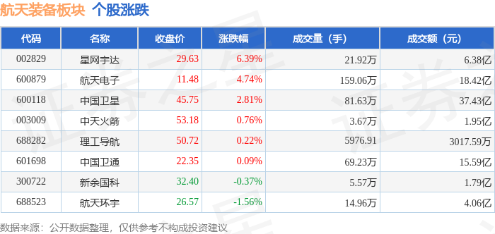 证券之星消息,11月10日航天装备板块较上一交易日上涨1.67%,星网宇达领涨。当日上证指数报收于 4018.6,上涨0.53%。深证成指报收于13427.61,上涨0.18%。航天装备板块个股涨跌见下表: | 代码 | 名称 | 收盘价 | 涨跌幅 | 成交量(手) | 成交额(元) | | --- | --- | --- | --- | --- | --- | | 002829 | 星网宇达 | 29.63 | 6.39% | 21.92万 | 6.38 Z | | 600879 | 航天电子 | 11.48 | 4.74% | 159.06万 | 18.42 Z | | 600118 | 中国卫星 | 45.75 | 2.81% | 81.63万 | 37.43 Z | | 003009 | 中天火箭 | 53.18 | 0.76% | - 3.67万 | 1.95亿 | | 688282 | 理工导航 | 50.72 | 0.22% | 5976.91 | 3017.59万 | | 601698 | 中国 通 | 22.35 | 0.09% | 69.23万 | 15.59亿 | | 300722 | ...