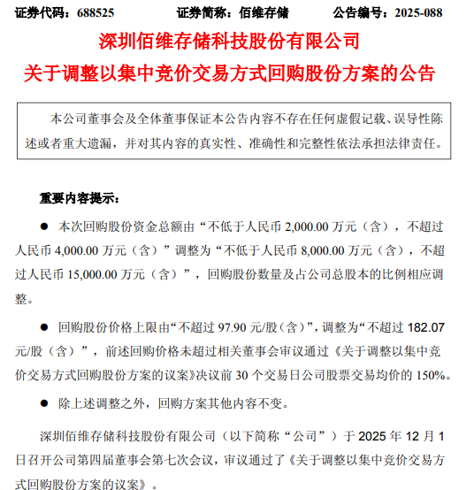 A股存储器头部企业佰维存储(688525)12月1日晚间公告,为进一步提高资产的流动性和使用效率,上市 公司将择机出售公司持有的联芸科技(688449)相关股票资产,另外,公司拟扩大股票回购规模和价格上 限,提升回购力度。 同日,佰维存储调整回购计划,回购股份资金总额由不低于2000万元(含),不超过4000万元(含)调整为 不低于8000万元(含),不超过1.5亿元(含),回购股份数量及占公司总股本的比例相应调整;回购股份价 格上限由不超过97.9元/股(含),调整为不超过182.07元/股(含)。 公告显示,联芸科技于2024年11月29日在科创板上市,佰维存储系联芸科技战略配售股东,战略配售价 格为11.25元/股。截至2025年9月30日,公司持有联芸科技374.47万股,持股比例为0.81%。 自2025年12月1日起,公司所持联芸科技首发限售股份解除限售并上市流通,公司可以对持有的联芸科 技股票进行减持。为进一步提高资产的流动性和使用效率,上市公司拟根据股票市场行情以集中竞价交 易的方式择机出售所持联芸科技部分或全部A股股票,占其总股本的比例不超过1%。 佰维存储披露,目前该交易性金融资产账面成本 ...