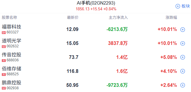 早盘,AI手机概念反复活跃,道明光学(002632)4连板,福蓉科技(603327)2连板,美芯晟、传音控股、佰维存储、中石科技等涨幅居前。 | < V | AI手机 | | | E | () | | --- | --- | --- | --- | --- | --- | | | 1918.53 | 0.63% | | | | | 分时 王日 | 日 K | 周K | 目 K | | 更多,◎ | | 成份股 | 股吧 | | | 资讯 | | | 名称 | 最新 | | 涨幅 ↓ | | 涨跌 | | 道明光学 | 15.05 | | 10.01% | | 1.37 | | 002632 | | | | | | | 福蓉科技 | 12.09 | | 10.01% | | 1.10 | | 603327 | | | | | | | 美芯晟 | 43.43 | | 9.78% | | 3.87 | | 688458 科创 註 | | | | | | | 传音控股 | 72.37 | | 3.18% | | 2.23 | | 688036 科创 註 | | | | | | | 佰维存储 | 115.25 | | ...