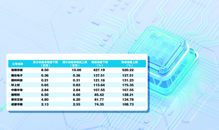 | 公司名称 | 预计日母净利润下限 (1676) | 预计日母净利润上限 ( (G 7G ) | 预增幅度下限 ( % ) | 预增幅度上限 (%) | | --- | --- | --- | --- | --- | | 佰维存储 | 8.50 | 10.00 | 427.19 | 520.22 | | 极伦电子 | 0.36 | 0.36 | 137.51 | 137.51 | | 朗科科技 | 0.21 | 0.31 | 121.16 | 131.23 | | 好上好 | 0.65 | 0.83 | 115.64 | 175.35 | | 中徽半导 | 2.84 | 2.84 | 107.55 | 107.55 | | 德明利 | 6.50 | 8.00 | 85.42 | 128.21 | | 骨农芯创 | 4.80 | 6.20 | 81.77 | 134.78 | | 成建丰盛 | 2.13 | 2.55 | 74.35 | 108.73 | 部分存储芯片公司2025年预计业绩 郭晨凯 制图 ◎记者 李兴彩 随着上市公司2025年度业绩预告进入高峰期,存储芯片产业链公司的盈利能力增长成为市场的一道 ...