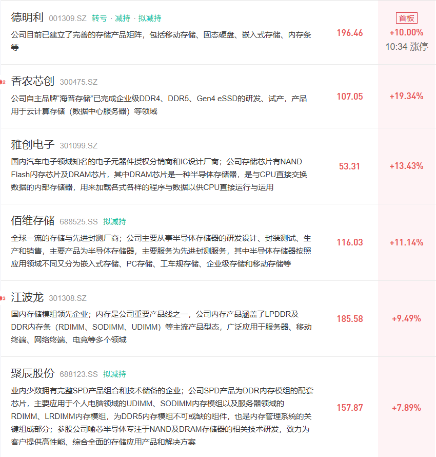 1)当地时间10月15日,美股存储股再度大涨。其中闪迪涨超13%刷新历史新高,自8月以来涨超三倍;西部数据涨近 6.5%、希捷科技涨超3.6%、美光科技涨超2.6%。 10月16日,内存板块迎来集体大涨。德明利涨停,香农芯创涨近20%,佰维存储、雅创电子、江波龙涨超10%,聚辰股 份、兆易创新、大为股份等集体大涨。 一、行情 | 德明利 001309.SZ 转亏·减持·拟减持 | | 首板 | | --- | --- | --- | | 公司目前已建立了完善的存储产品矩阵,包括移动存储、固态硬盘、嵌入式存储、内存条 | 196.46 | +10.00% | | 部 | | 10:34 涨停 | | 2 香农村创 300475.SZ | | | | 公司自主品牌"海普存储"已完成企业/级DDR4、DDR5、Gen4 eSSD的研发、试产,产品 | 107.05 | +19.34% | | 用于云计算存储(数据中心服务器)等领域 | | | | 雅创电子 301099.SZ | | | | 国内汽车电子领域知名的电子元器件授权分销商和IC设计厂商;公司存储芯片有NAND | 53.31 | +13.43% | | ...
