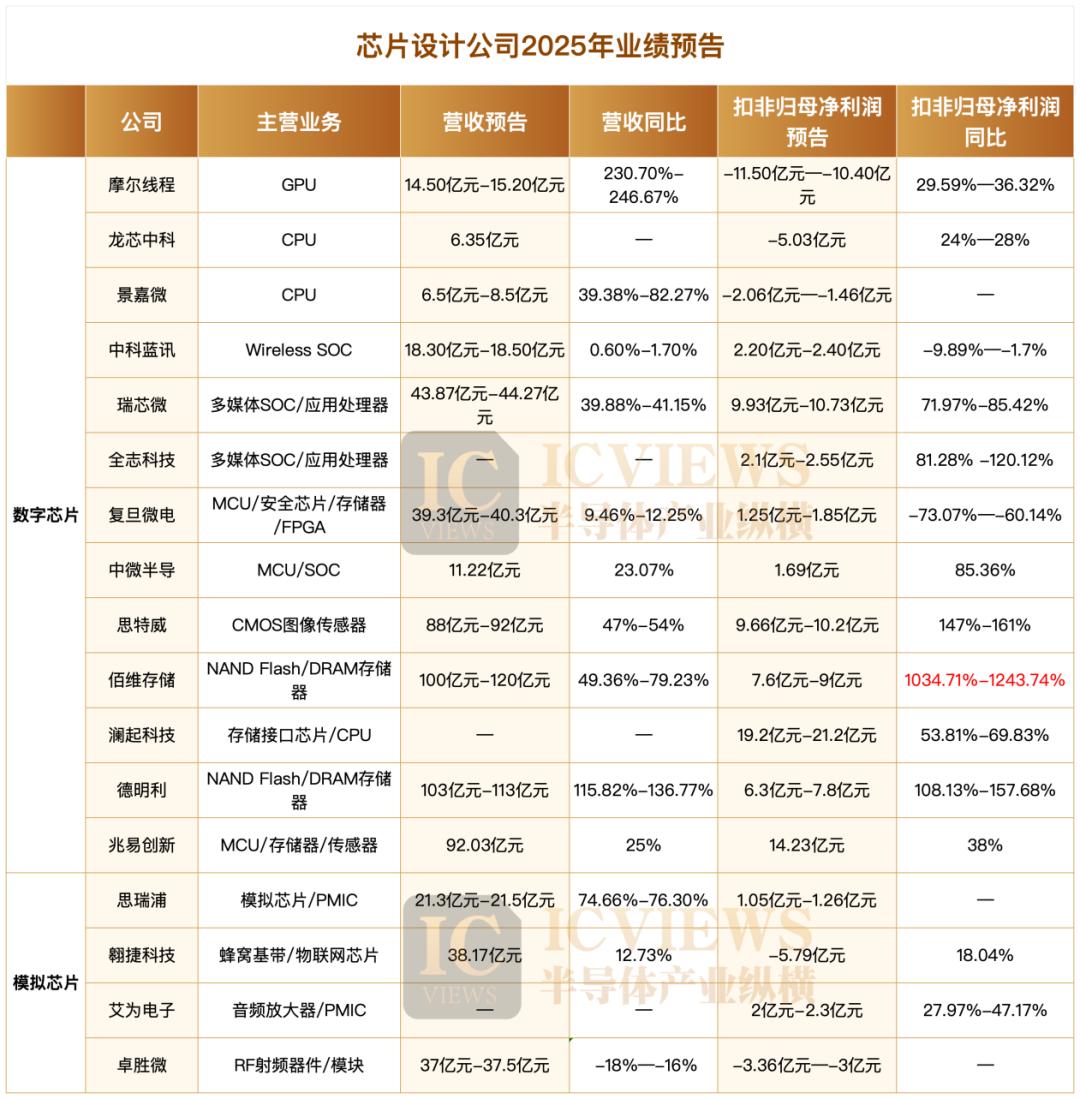 IC设计,冰火两重天 IC设计是本次业绩分化最剧烈的赛道,数字芯片公司方面,可以看到收入高增长与亏损并存的现象,模拟芯片业绩分化现象仍在持续。 | | | | 芯片设计公司2025年业绩预告 | | | | | --- | --- | --- | --- | --- | --- | --- | | | 公司 | 主营业务 | 营收预告 | 营收同比 | 扣非归母净利润 | 扣非归母净利润 | | | | | | | 预告 | 同比 | | | 摩尔线程 | GPU | 14.50亿元-15.20亿元 | 230.70%- | -11.50亿元-- 10.40亿 | 29.59%-36.32% | | | | | | 246.67% | 元 | | | | 龙芯中科 | СРИ | 6.35亿元 | - | -5.03亿元 | 24%-28% | | | 景嘉微 | СРИ | 6.5亿元-8.5亿元 | 39.38%-82.27% | -2.06亿元 -- 1.46亿元 | - | | | 中科蓝讯 | Wireless SOC | 18.30亿元-18.50亿元 | 0.60%-1.70% | 2.20亿元 ...