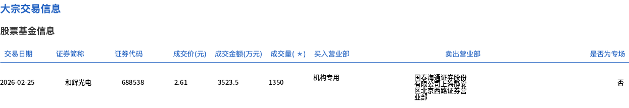 2月25日,和辉光电大宗交易成交1350万股,成交额3523.5万元,占当日总成交额的17.59%,成交价2.61元,较市场收盘价2.63元折价0.76%。 | 交易日期 | 证券简称 | 证券代码 | 成交价(元) 成交金额(万元) 成交量( * ) 买入营业部 | | | | 卖出营业部 | | --- | --- | --- | --- | --- | --- | --- | --- | | 2026-02-25 | 和辉光电 | 688238 | 2.61 3523.5 | 1350 | 机构专用 | 国泰海通证券股份 有限公司上海静安 区北京商路 区北京商路 | | ...