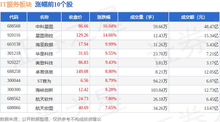 | 代码 | 名称 | 收盘价 | 涨跌幅 | 成交量(手) | 成交额(元) | | | --- | --- | --- | --- | --- | --- | --- | | 688568 | 中科星图 | 86.66 | 16.04% | 59.66万 | | 48.47 乙 | | 920116 | 晶图测控 | 129.26 | 14.66% | 12.43万 | | 15.34亿 | | 603138 | 海量数据 | 17.94 | 9.99% | 31.26万 | | 5.43亿 | | 301218 | 华是科技 | 31.65 | 9.55% | 1 23.70万 | | 7.21亿 | | 920227 | 美登科技 | 86.83 | 9.43% | 3.81万 | | 3.17亿 | | 688258 | 卓易信息 | 149.08 | 8.80% | 8.21万 | | 12.05亿 | | 300044 | ST赛为 | 6.56 | 8.79% | 94.21万 | | 6.07亿 | | 300300 | 海峡创新 | 12.42 | 8.28% | 103.84万 | | ...