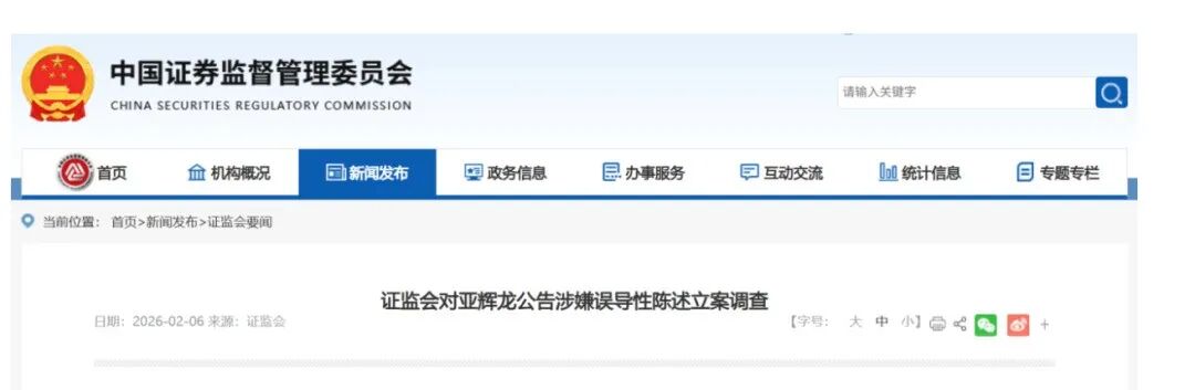 登录新浪财经APP 搜索【信披】查看更多考评等级 来源:公司公告 2026年2月6日,深圳市亚辉龙生物科技股份有限公司(股票代码:688575,以下简称"亚辉龙")发布公告称,公司于当日收到中国证券监督管理委员会 (以下简称"证监会")下发的《立案告知书》。 因公司涉嫌在信息披露中存在误导性陈述,根据《中华人民共和国证券法》等相关法律法规,证监会决定对公司立案调查。 尽管亚辉龙已收到交易所警示,但监管并未止步。2月6日,证监会正式对其立案调查。下一步,证监会将在全面调查的基础上依法处理,切实维护市场健 康发展。 本文为转载发布,仅做分享,文章中观点仅代表原平台作者观点,与本平台无关。如若本文有与贵平台发布原创内容有重合之处,或未经授权使用,系原 平台行为,本平台仅转载。您可以第一时间联系我们删除文章,我们会立即响应! 登录新浪财经APP 搜索【信披】查看更多考评等级 来源:公司公告 亚辉龙(股票代码:688575)成立于2008年,总部位于深圳,是一家专注于体外诊断(IVD)领域的高新技术企业。公司主营业务为化学发光免疫诊断试 剂、生化诊断试剂及相关仪器的研发、生产和销售,拥有自主研发的磁微粒化学发光技术平台 ...