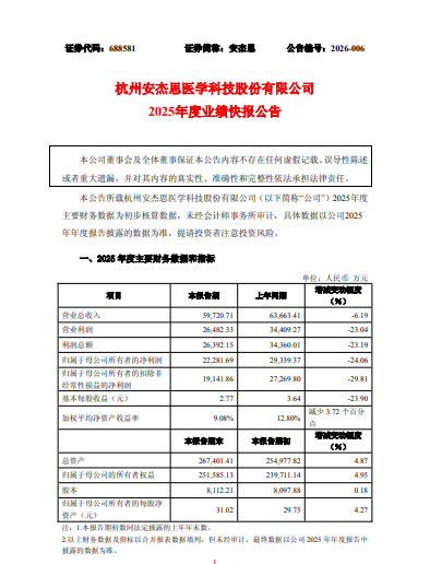 证券代码:688581 证券简称:安杰思 公告编号:2026-006 3.上表中基本每股收益的普通股股数为总股本扣除回购股份的加权平均数和期末发行在外的限 制性股票的股数。归属于母公司所有者的每股净资产中期末普通股股数为总股本扣除回购股份数。 4.以上数据如有尾差,系四舍五入所致。 二、经营业绩和财务状况情况地方说明 1、报告期内公司经营情况和财务状况 杭州安杰思医学科技股份有限公司 2025年度业绩快报公告 本公司董事会及全体董事保证本公告内容不存在任何虚假记载、误导性陈述 或者重大遗漏,并对其内容的真实性、准确性和完整性依法承担法律责任。 本公告所载杭州安杰思医学科技股份有限公司(以下简称"公司")2025年度 主要财务数据为初步核算数据,未经会计师事务所审计,具体数据以公司2025 年年度报告披露的数据为准,提请投资者注意投资风险。 | | | 单位:人民币 | 万元 | | --- | --- | --- | --- | | 项目 | 本报告期 | 上年同期 | 增减变动幅度 (%) | | 营业总收入 | 59,720.71 | 63,663.41 | -6.19 | | 营业利润 | 26,482 ...