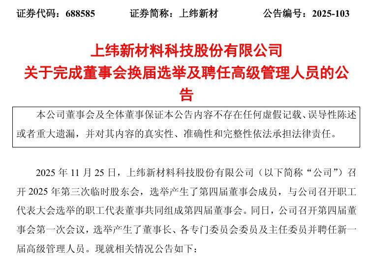 11月25日晚,上纬新材公告,第四届董事会第一次会议选举"稚晖君"彭志辉(稚晖君)为董事长,任期三年。 具体来看,公告显示,上纬新材已完成董事会换届选举,并聘任新一届公司高管人员。彭志辉、田华、周斌、姜青松、钮嘉为公司第四届董事会非独立董 事;邓小洋、马惠敏、沈震为公司第四届董事会独立董事。5名非独立董事、3名独立董事和1名职工代表董事共同组成公司第四届董事会,任期自2025年第 三次临时股东会审议通过之日起三年。 此外,上纬新材聘任田华为公司首席执行官(总经理、CEO),并担任法定代表人;周斌为公司联席首席执行官(Co-CEO)兼首席技术官(CTO);章彪 为公司首席财务官(财务负责人、CFO);李元为公司董事会秘书。 相关资料显示,彭志辉本硕毕业于电子科技大学,曾是华为"天才少年"、B站"顶流"科技UP主,被粉丝们称作"稚晖君""野生钢铁侠",也是人形机器人领 域"独角兽"企业智元机器人的联合创始人、总裁兼CTO(首席技术官)。 相关公告内容截图 他于2022年底离职创业。2023年2月,他作为联合创始人成立智元机器人,智元机器人自成立以来便成为VC圈最火爆的项目之一,成立仅一年多时间内,已 获得多轮融资 ...