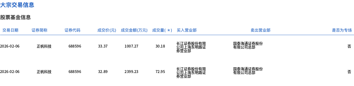 | 交易日期 | 证券简称 | 证券代码 | 成交价(元) | 成交金额(万元) 成交量( * ) 买入营业部 | | | | 卖出营业部 | | --- | --- | --- | --- | --- | --- | --- | --- | --- | | 2026-02-06 | 正帆科技 | ୧୫୫୧୫୧ | 33.37 | 1007.27 | 30.18 | 长江证券股份有限 公司上海东明路证 券营业部 | 国泰海通证券股份 有限公司总部 | | | 2026-02-06 | 正帆科技 | ୧୫୫୧୦୧ | 32.89 | 2399.23 | 72.95 | 长江证券股份有限 公司上海东明路证 泰营业部 | 国泰海通证券股份 有限公司总部 | | 2月6日,正帆科技大宗交易成交103.13万股,成交额3406.5万元,占当日总成交额的18.34%,成交均价33.03元,较市场收盘价32.53元溢价1.54%,其中最高 成交价33.37元,最低成交价32.89元。 ...