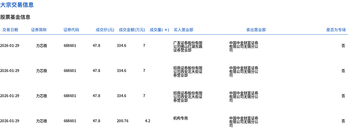 | 交易日期 | 证券简称 | 证券代码 | | | 成交价(元) 成交金额(万元) 成交量(*) 买入营业部 | | 类出管业部 | 是否为专场 | | --- | --- | --- | --- | --- | --- | --- | --- | --- | | 2026-01-30 | 力芯微 | 688601 | 43.8 | 210.24 | 4.8 | 容量清制分类意 | 品质量的通用品 | 客 | | 2026-01-30 | 力芯微 | 688601 | 43.8 | 201.48 | 4.6 | 去島景和男恩曹氏 | 去震去意受重分公 | KA | | 2026-01-30 | 力芯微 | 688601 | 43.8 | 201.48 | 4.6 | 机构专用 | 有限公司 分公 | 줄 | | 2026-01-30 | 力芯微 | 688601 | 43.8 | 200.17 | 4.57 | 送高产素男公有限 | 去圓去高覽量男公 | 图 | | 2026-01-30 | 力芯微 | 688601 | 43.8 | 200.17 | 4.57 | | 我殿去高史童劳么 | KI | | ...