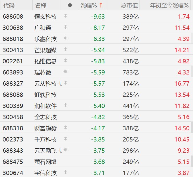 1月13日,A股市场AI应用概念股尾盘快速下挫,其中,恒玄科技跌超9%,广和通跌超8%,乐鑫科技跌 超6%,芒果超媒、拓维信息、瑞芯微、云从科技、虹软科技、润和软件跌超5%。 | 代码 | 名称 | | 涨幅% ↑ | 总市值 | 年初至今涨幅% | | --- | --- | --- | --- | --- | --- | | 688608 | 恒玄科技 | 1 | -9.63 | 389亿 | 1.74 | | 300638 | 厂和通 | 1 | -8.17 | 297亿 | 11.54 | | 688018 | 乐鑫科技 | 兼 | -6.33 | 297亿 | 4.39 | | 300413 | 芒果超媒 | 1 | -5.94 | 522亿 | 14.21 | | 002261 | 拓维信息 | मे | -5.83 | 438亿 | 4.92 | | 603893 | 瑞芯微 | 来 | -5.59 | 783亿 | 4.32 | | 688327 | 云从科技-l x | | -5.57 | 174亿 | 16.77 | | 688088 | 虹软科技 | | -5.53 | 225亿 | 1 ...