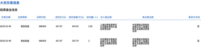 | 交易日期 | 证券简称 | 证券代码 | 成交价(元) 成交金额(万元) 成交量( *) 买入营业部 | | | 类出管业部 | 是否为专场 | | --- | --- | --- | --- | --- | --- | --- | --- | | 2026-02-09 | 恒玄科技 | 688888 | 167.87 2.05 | 344.55 | 是比较 158 88 | 中信建投平分股份 | M | | | | | | | | AR BE | | | 2026-02-09 | 恒玄科技 | 688608 | 167.87 | 335.74 | 中廣建當年落盤樂 | 中信建投证券股份 | Ka | 2月9日,恒玄科技大宗交易成交4.05万股,成交额680.29万元,占当日总成交额的1.38%,成交价167.87 元,较市场收盘价211.57元折价20.66%。 ...