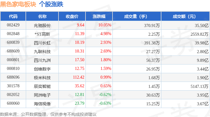 证券之星消息,1月12日黑色家电板块较上一交易日上涨5.52%,四川长虹领涨。当日上证指数报收于 4165.29,上涨1.09%。深证成指报收于14366.91,上涨1.75%。黑色家电板块个股涨跌见下表: | 代码 | 名称 | 收盘价 | 涨跌幅 | 成交量(手) | 成交额(元) | | --- | --- | --- | --- | --- | --- | | 600839 | 四川长虹 | 10.38 | 9.96% | 401.53万 | 39.98 Z | | 002429 | 兆驰股份 | 8.31 | 7.23% | 246.66万 | 19.80 Z | | 002848 | *ST高斯 | 10.78 | 4.97% | ● 3.63万 | 3887.82万 | | 600060 | 海信视像 | 25.35 | 4.32% | 30.02万 | 7.65亿 | | 000801 | 四川九洲 | 18.51 | 3.70% | 52.92万 | 9.69 G | | 000810 | 创维数字 | 12.92 | 3.28% | 30.71万 | 3.93亿 | | 301578 | ...