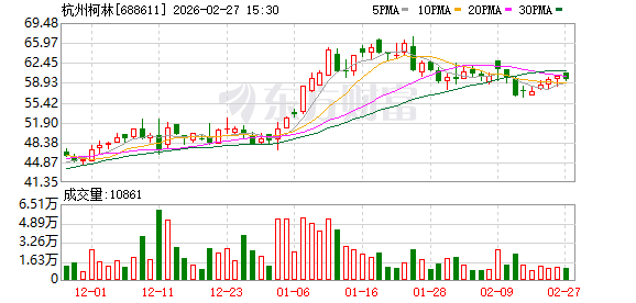 截至9月30日,杭州柯林股东户数4569.00,较上期增加7.25%;人均流通股33571股,较上期减少 6.76%。2025年1月-9月,杭州柯林实现营业收入1.38亿元,同比减少47.48%;归母净利润60.47万元,同 比减少98.14%。 分红方面,杭州柯林A股上市后累计派现1.45亿元。近三年,累计派现6104.28万元。 声明:市场有风险,投资需谨慎。本文基于第三方数据库自动发布,不代表新浪财经观点,任何在本文 出现的信息均只作为参考,不构成个人投资建议。如有出入请以实际公告为准。如有疑问,请联系 biz@staff.sina.com.cn。 责任编辑:小浪快报 2月24日,杭州柯林涨2.13%,成交额7334.20万元。两融数据显示,当日杭州柯林获融资买入额1284.31 万元,融资偿还776.52万元,融资净买入507.79万元。截至2月24日,杭州柯林融资融券余额合计5.46亿 元。 融资方面,杭州柯林当日融资买入1284.31万元。当前融资余额5.46亿元,占流通市值的6.08%,融资余 额超过近一年80%分位水平,处于高位。 融券方面,杭州柯林2月24日融券偿还200.00股,融券卖出1 ...