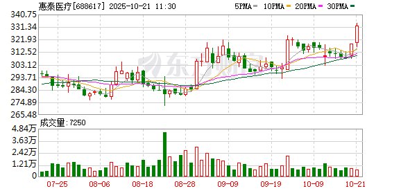 (文章来源:证券时报网) 证券时报·数据宝统计显示,惠泰医疗所属的医药生物行业,目前整体涨幅为0.55%,行业内,目前股价 上涨的有374只,涨停的有广济药业、特一药业等3只。股价下跌的有108只,跌幅居前的有亚太药业、 昂利康、舒泰神等,跌幅分别为5.71%、5.69%、5.03%。 两融数据显示,该股最新(10月20日)两融余额为1.26亿元,其中,融资余额为1.07亿元,近10日增加 670.76万元,环比增长6.66%。 公司发布的半年报数据显示,上半年公司共实现营业收入12.14亿元,同比增长21.26%,实现净利润 4.25亿元,同比增长24.11%,基本每股收益为3.0200元,加权平均净资产收益率15.55%。(数据宝) 惠泰医疗股价创出历史新高,截至11:08,该股上涨3.65%,股价报330.08元,成交量56.50万股,成交金 额1.83亿元,换手率0.40%,该股最新A股总市值达465.46亿元,该股A股流通市值465.46亿元。 ...