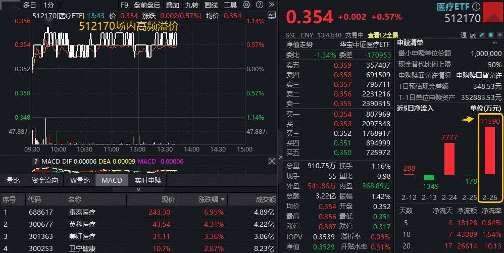 2月27日,医疗板块震荡飘红,全市场规模最大医疗ETF(512170)盘初一度涨逾1%,而后维持红盘, 走势强于大市。场内延续高频溢价,昨日逾1.15亿元资金进场净申购。 | 分时 多日 1分 * | | | | | F9 盘前盘后 望加 九转 画技 工具 (9 (2 ) | | | | | | | | 医疗ETF O | | --- | --- | --- | --- | --- | --- | --- | --- | --- | --- | --- | --- | --- | --- | | 0.356 | | | | 512170(医疗ETF) 13:43 价 0.354 滋肤 0.002(0.57%) 均价 0.354 | | | D 1.1496 | | | 0.354 +0.002 +0.57% | | | SOLD A | | | | | 12170场内高频道价 | | | | | | | | | | | | | | | LAND WILL | | | | 0.5796 | | 净值击势 | SSE CNY 13:43:40 交易中 查看L2全国 | 华宝中证医疗ETF | 中發清单 | 通用7 ...