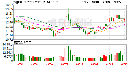Core Viewpoint - Ankai Microelectronics has shown a positive stock performance since its listing, with a notable increase in stock price and trading volume, despite a decline in revenue and net profit for the year [2][3]. Group 1: Stock Performance - On January 16, Ankai Micro's stock rose by 2.07%, reaching 12.83 CNY per share, with a trading volume of 83.82 million CNY and a turnover rate of 2.86%, resulting in a total market capitalization of 5.03 billion CNY [1]. - Year-to-date, Ankai Micro's stock price has increased by 6.56%, with a 1.10% rise over the last five trading days, a 13.14% increase over the last 20 days, and a 0.63% increase over the last 60 days [2]. Group 2: Financial Performance - For the period from January to September 2025, Ankai Micro reported a revenue of 351 million CNY, representing a year-on-year decrease of 5.22%, while the net profit attributable to shareholders was -82.24 million CNY, a significant decline of 267.46% [2]. - Cumulative cash dividends since the A-share listing amount to 11.76 million CNY [3]. Group 3: Company Overview - Ankai Microelectronics, established on April 10, 2001, and listed on June 27, 2023, is based in Guangzhou, Guangdong Province, and specializes in the research, design, testing, and sales of core SoC chips for IoT smart hardware [2]. - The company's main revenue sources include IoT camera chips (79.07%), IoT application processor chips (18.32%), and other products (1.73%) [2]. - Ankai Micro is classified under the electronic-semiconductor-digital chip design industry and is associated with concepts such as smart home, SOC chips, smart glasses, NPU, and smart speakers [2].