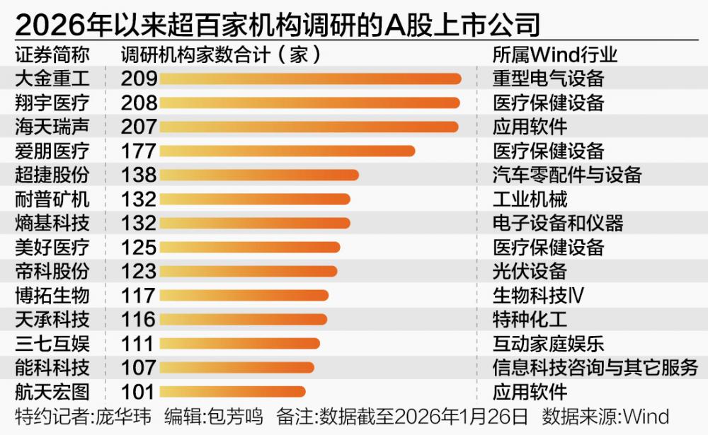 2026年伊始,A股市场迎来机构调研热潮。 截至1月26日,已有超过500家上市公司接受机构调研,其中工业机械、电子元件、电气设备、半导体及汽车零配件等行业成为关注重点。 其中,"硬科技"与"出海"主线尤为突出。 在个股层面,大金重工、翔宇医疗、海天瑞声等14家公司获得超百家机构扎堆调研,其中大金重工以209家机构调研数量位居第一。 格上基金研究员托合江指出,2026年以来机构调研总次数为801次,而2025年同期为953次,A股机构调研整体活跃度虽有所回落,但当前调研 活动更集中于高景气赛道,凸显机构布局的结构性特征。 从调研频率看,泰和新材以12次调研位居榜首,冰轮环境以10次紧随其后,汇川技术和天禄科技分别为9次,博盈特焊和太力科技分别为8次。 这些高频被调研公司主要集中在制造业和技术创新领域。 从行业分布来看,机构调研呈现出明显的硬科技与高端制造导向。工业机械行业以55家公司被调研位居第一,成为机构关注的焦点领域。 电子元件行业有35家公司获得调研,紧随其后。此外,电子设备和仪器、电气部件与设备、商品化工、汽车零配件与设备、集成电路等行业分 别有29家、27家、26家、22家和22家公司被调研。 值得 ...