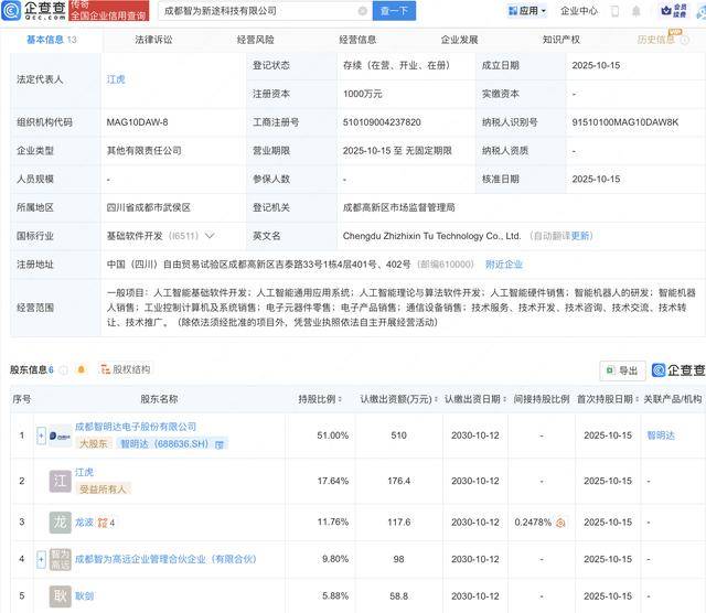 Core Insights - Chengdu Zhizhixin Tu Technology Co., Ltd. has been established with a registered capital of 10 million yuan, focusing on artificial intelligence software and hardware development, as well as intelligent robotics [1][2] Company Information - The company is registered in Chengdu, Sichuan Province, and is classified as a limited liability company [2] - The legal representative is Jiang Hu, and the company is currently in operation [2] - The business scope includes AI theory and algorithm software development, AI hardware sales, and intelligent robot research and sales [1][2] Shareholding Structure - Chengdu Zhizhixin Tu Technology Co., Ltd. is jointly held by Zhimingda (688636) and other shareholders [1] - Zhimingda holds a 51% stake, contributing 5.1 million yuan, while other shareholders include individuals and partnerships with varying ownership percentages [2]