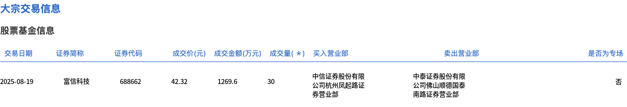 8月18日,富信科技大宗交易成交50万股,成交额2116万元,占当日总成交额的6.72%,成交价42.32元,较市场收盘价48.87元折价13.4%。 | 交易日期 | 证券简称 | 证券代码 | | | 成交价(元) 成交金额(万元) 成交量(*) 买入营业部 | | | 卖出营业部 | | --- | --- | --- | --- | --- | --- | --- | --- | --- | | 2025-08-18 | 富信科技 | 688662 | 42.32 | 1269.6 | 30 | 中信证券股份有限 | 中泰证券股份有限 | | | | | | | | | 公司杭州凤起路证 | 公司佛山顺德国泰 | | | | | | | | | 券营业部 | 南路证券营业部 | | | 2025-08-18 | 富信科技 | 688662 | 42.32 | 846.4 | 20 | 中信证券股份有限 | 中泰证券股份有限 | | | | | | | | | 公司杭州凤起路证 | 公司佛山顺德国泰 | | | | | | | | | 券营业部 | 南路证券营业部 | | ...