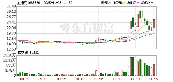 (文章来源:证券时报网) 科创板个股中,截至发稿上涨的共有550只,涨幅在10%以上的共有16只,除金迪克之外,涨停的还有 德科立、长光华芯、禾信仪器等,下跌的有37只,跌幅较大的有菱电电控、华曙高科、品茗科技,分别 下跌8.10%、8.03%、6.38%。 资金面上,金迪克上一交易日主力资金净流入157.71万元,近5日净流出3045.58万元。 融资融券数据显示,该股最新(11月24日)两融余额为4121.53万元,其中,融资余额为4121.53万元, 较上一个交易日减少284.79万元,降幅为6.46%;近10日两融余额合计增加1820.34万元,增幅为 79.10%,其间融资余额增长79.10%。(数据宝) 11月25日盘中科创板股金迪克涨停,截至11:15,股价报25.75元,成交1.98亿元,换手率6.75%,振幅 18.69%。 ...
