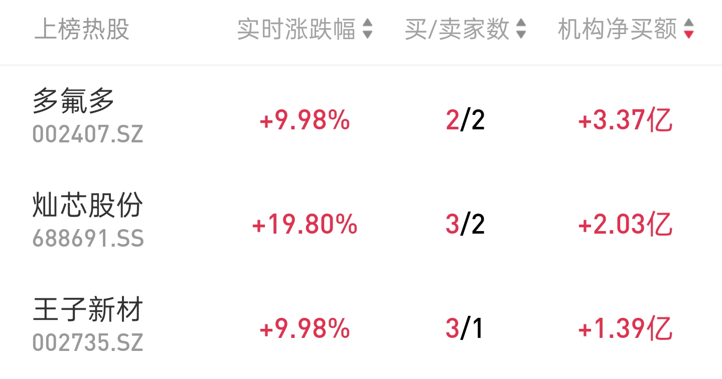 龙虎榜机构热股 今天机构龙虎榜上榜42只个股,净买入26只,净卖出16只。当日机构买入最多的个股前三位是:多氟多(3.37亿)、灿芯股份(2.03亿)、王子新材(1.39 亿)。 | 上榜热股 | 实时涨跌幅♀ 买/卖家数♀ | | | --- | --- | --- | | 多氟多 | +9.98% | 2/2 | | 002407.SZ | | | | 灿芯股份 | +19.80% | 3/2 | | 688691.SS | | | | 王子新材 | +9.98% | 3/1 | | 002735.SZ | | | 多氟多 龙虎榜显示,今日2家机构净买入3.37亿。 公司为全球六氟磷酸锂龙头之一,表示对固态电池保持高度关注,并具备部分材料产业化的能力;拥有"氟资源→氢氟酸及电子级氢氟酸→氟化锂→六氟磷 酸锂→锂电池"完整的产业链。 龙虎榜知名游资 一、稀土磁材 中国稀土 个股龙虎榜 六大稀土集团之一中国五矿的唯一稀土上市平台。 银河磁体 个股龙虎榜 此外,10月9日,包钢股份公告,拟将2025年第四季度稀土精矿关联交易价格调整为不含税26205元/吨(干量,REO=50%)。 10月10日,北方稀土公告, ...