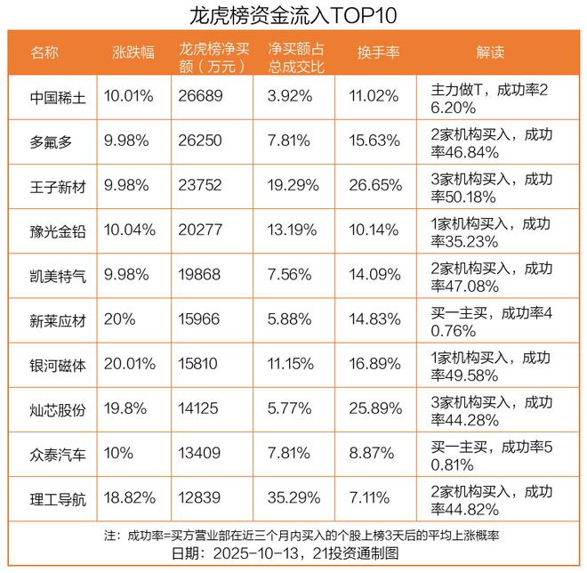 10月13日,上证指数下跌0.19%,深证成指下跌0.93%,创业板指下跌1.11%。盘后龙虎榜数据显示,共 有59只个股因当日异动登上龙虎榜,资金净流入最多的是中国稀土(000831.SZ),达2.67亿元。 据21投资通智能监测,36只个股龙虎榜出现了机构的身影,北向资金参与龙虎榜中的个股共涉及25只。 | 名称 | 涨跌幅 | 戊席榜净买 | 净买额占 | 换手率 | 解读 | | --- | --- | --- | --- | --- | --- | | | | 额(万元 | 总成交比 | | | | 中国稀土 | 10.01% | 26689 | 3.92% | 11.02% | 主力做T,成功率2 6.20% | | 多包多 | 9.98% | 26250 | 7.81% | 15.63% | 2家机构买入,成功 率46.84% | | 王子新材 | 9.98% | 23752 | 19.29% | 26.65% | 3家机构买入,成功 率50.18% | | 豫光金铅 | 10.04% | 20277 | 13.19% | 10.14% | 1家机构买入,成功 率35.23% | | 凯美特气 ...