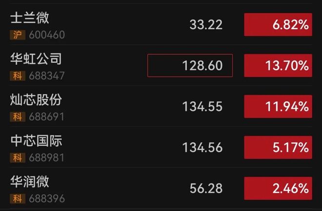 | 士兰微 | 33.22 | 6.82% | | --- | --- | --- | | 沪 600460 | | | | 华虹公司 | 128.60 | 13.70% | | 科 688347 | | | | 灿芯股份 | 134.55 | 11.94% | | 科 688691 | | | | 中芯国际 | 134.56 | 5.17% | | 科 688981 | | | | 华润微 | 56.28 | 2.46% | | 科 688396 | | | (头图由AI生成) 10月13日盘中,半导体产业链持续走强,晶圆代工、先进封装等方向拉升。华虹公司、 灿芯股份 涨超10%, 士兰微涨近7%, 中芯国际涨逾5%, 华 润微、 新洁能、三安光电、富满微均走高。 ...
