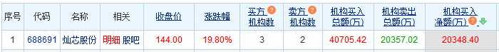 中国经济网北京10月13日讯今日,灿芯股份(688691.SH)收报144.00元,涨幅19.80%。 龙虎榜数据显示,买入灿芯股份金额最大的前5名中,3家为机构专用席位。卖出灿芯股份金额最大的前5名中,2家为机构专用席位。经统计,机构席位今日 买入灿芯股份净额为20348.40万元。 | 买入金额最大的前5名 | | | | | | | | | --- | --- | --- | --- | --- | --- | --- | --- | | 序号 | 交易营业部名称 | | | 买入金额(万) | 占总成交比例 | 卖出金额(万) | 占总成交比例 | | 1 机构专用 | | 1576次 43.21% | C | 22638.94 | 9.25% | | | | 2 沪股通专用 | | 613次 47.96% | ▶ | 18539.77 | 7.58% | | | | 3 机构专用 | | 1576次 43.21% | | 11545.79 | 4.72% | | | | র্ণ 机构专用 | | 1576次 43.21% | | 6520.69 | 2.66% | | | | 5 | 中国国际金融股 ...