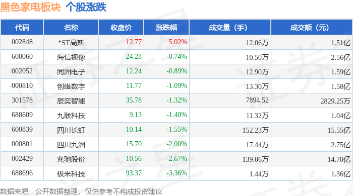 证券之星消息,1月28日黑色家电板块较上一交易日下跌1.68%,极米科技领跌。当日上证指数报收于 4151.24,上涨0.27%。深证成指报收于14342.9,上涨0.09%。黑色家电板块个股涨跌见下表: | 代码 | 名称 | 收盘价 | 涨跌幅 | 成交量(手) | 成交额(元) | | | --- | --- | --- | --- | --- | --- | --- | | 002848 | *ST高斯 | 12.77 | 5.02% | 12.06万 | | 1.51亿 | | 600060 | 海信视像 | 24.28 | -0.74% | 10.50万 | | 2.56亿 | | 002052 | 同洲电子 | 12.24 | -0.89% | 12.90万 | | 1.59亿 | | 000810 | 创维数字 | 11.77 | -1.09% | - 13.30万 | | 1.58亿 | | 301578 | 辰奕智能 | 35.78 | -1.32% | 7894.52 | | 2829.25万 | | 688609 | 九联科技 | 9.13 | -1.40% | 11.32万 | | ...