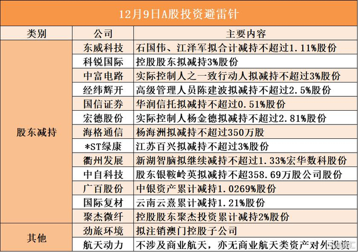 | | | 12月9日A股投资避雷针 | | --- | --- | --- | | 类别 | 公司 | 主要内容 | | 股东减持 | 东威科技 | 石国伟、江泽军拟合计减持不超过1.11%股份 | | | 科锐国际 | 控股股东拟减持3%股份 | | | 中富电路 | 实际控制人之一致行动人拟减持不超过3%股份 | | | 经纬辉开 | 高级管理人员陈建波拟减持不超过2.5%股份 | | | 国信证券 | 华润信托拟减持不超过0.51%股份 | | | 宏德股份 | 实际控制人杨金德拟减持不超过2.81%股份 | | | 海格通信 | 杨海洲拟减持不超过350万股 | | | *ST绿康 | 江苏百兴拟减持不超过3%股份 | | | 葡州发展 | 新湖智脑拟继续减持不超过1.33%宏华数科股份 | | | 中自科技 | 股东银鞍岭英拟减持不超358.69万股公司股份 | | | 广百股份 | 中银资产累计减持1.0269%股份 | | | 国际复材 | 云南云熹累计减持1.21%股份 | | | 聚杰做纤 | 控股股东聚杰投资累计减持2%股份 | | 其他 | 劲旅环境 | 拟注销澳门控股子公司 | | ...