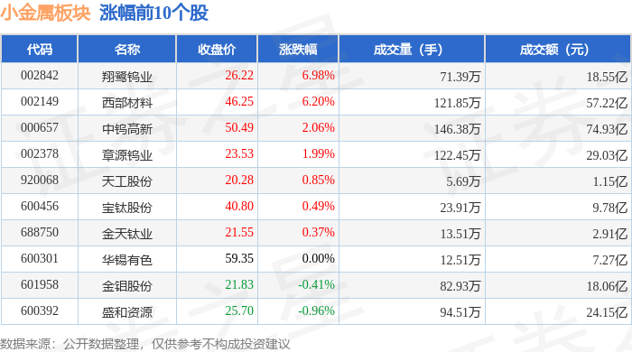 证券之星消息,1月27日小金属板块较上一交易日下跌1.61%,中国铀业领跌。当日上证指数报收于 4139.9,上涨0.18%。深证成指报收于14329.91,上涨0.09%。小金属板块个股涨跌见下表: 从资金流向上来看,当日小金属板块主力资金净流出32.55亿元,游资资金净流入7.21亿元,散户资金净 流入25.34亿元。小金属板块个股资金流向见下表: | 代码 名称 | | 主力净流入(元) | 主力净占比 游资净流入 (元) | | 游资净占比 散户净流入 (元) | | 散户净占比 | | --- | --- | --- | --- | --- | --- | --- | --- | | 002149 | 西部材料 | 6.741Z | 11.79% | -4.69 Z | -8.19% | -2.06 Z | -3.60% | | 601958 | 金铝股份 | 433.28万 | 0.24% | -2003.57万 | -1.11% | 1570.28万 | 0.87% | | 688750 | 金天钛业 | 424.46万 | 1.46% | -40.62万 | -0.14% | -383.85万 ...