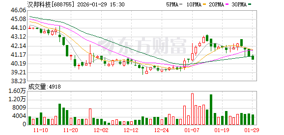 分红方面,汉邦科技A股上市后累计派现880.00万元。 资料显示,江苏汉邦科技股份有限公司位于江苏省淮安经济技术开发区新竹路10号,淮安经济技术开发 区集贤路1-9号,成立日期1998年10月28日,上市日期2025年5月16日,公司主营业务涉及为制药、生命 科学等领域提供专业的分离纯化装备、耗材、应用技术服务及相关的技术解决方案。主营业务收入构成 为:小分子药物分离纯化设备70.99%,大分子药物分离纯化设备22.94%,其他6.07%。 截至9月30日,汉邦科技股东户数8687.00,较上期减少7.31%;人均流通股1904股,较上期增加7.89%。 2025年1月-9月,汉邦科技实现营业收入5.06亿元,同比增长4.61%;归母净利润3701.72万元,同比减少 17.27%。 1月19日,汉邦科技跌0.10%,成交额1774.66万元。两融数据显示,当日汉邦科技获融资买入额152.72 万元,融资偿还445.62万元,融资净买入-292.90万元。截至1月19日,汉邦科技融资融券余额合计 6297.61万元。 融资方面,汉邦科技当日融资买入152.72万元。当前融资余额6291.74万元,占流通市值的 ...