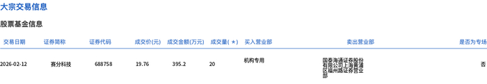 | 交易日期 | 证券简称 | 证券代码 | 成交价(元) 成交金额(万元) 成交量(*) 买入营业部 | | | | 卖出营业部 | 是否为专场 | | --- | --- | --- | --- | --- | --- | --- | --- | --- | | 2026-02-12 | 赛分科技 | 688758 | 19.76 395.2 | 20 | 机构专用 | 題為開業發 | | 150 | 2月12日,赛分科技大宗交易成交20万股,成交额395.2万元,占当日总成交额的3.69%,成交价19.76 元,较市场收盘价19.9元折价0.7%。 ...