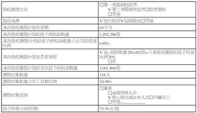 | 段权微历方式 | ■第一类限制性股票 | | --- | --- | | | V第二次吸制性設置口胶系防仪 | | | □其他 | | 胶分来源 | V发行股份V回购股份口其他 | | 本次段权激励计划有效期 | 60个月 | | 本次股权激励计划职投手的权益数量 | 1.252.258 2 | | 本次段权激励计划拟投于的权益数量占公司史殷本 | 0.85% | | Holst | | | | V是,预留数量250,452股;占本股权涨份投资予权益 | | 本次段权激励计划是否有预需 | 七月2016 | | | 同香 | | 本次段权激励计划都省次投手的权益教量 | 1.001.806 21 | | 激励对象教量 | 116/2 | | 蛋糕炒家数量占员工总数比例 | 24.58% | | | □胶浆 | | 高层对象製出 | 口高级管理人员 | | | V 核心技术或业务人员口外籍研工 | | | □其他 .. | | 技于价格/行段价格 | 73.78元/公 | | 日属朗 | | 对局常框年 | 霍非收人(A) | | | --- | --- | --- | --- | --- | | | | ...