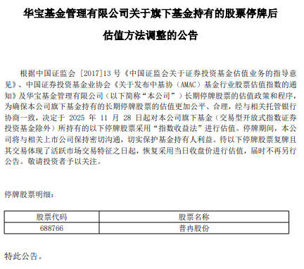 根据中国证监会[2017]13号《中国证监会关于证券投资基金估值业务的指导意见》、中国证券投资基金 业协会《关于发布中基协(AMAC)基金行业股票估值指数的通知》及华宝基金管理有限公司长期停牌股 票的估值政策和程序,为确保公司旗下基金持有的长期停牌股票的估值更加公平、合理,经与相关托管 银行协商一致,决定于2025年11月28日起对公司旗下基金(交易型开放式指数证券投资基金除外)所持有 的以下停牌股票"普冉股份(证券代码:688766)"采用"指数收益法"进行估值。 停牌期间,公司将与相关上市公司保持密切沟通,切实保护基金持有人利益。待停牌股票复牌且其交易 体现了活跃市场交易特征之日起,恢复采用当日收盘价进行估值,届时不再另行公告。 中国经济网北京12月1日讯近日,华宝基金管理有限公司发布关于旗下基金持有的股票停牌后估值方法 调整的公告。 | 股票代码 | 股票名称 | | --- | --- | | 688766 | 普冉股份 | ...