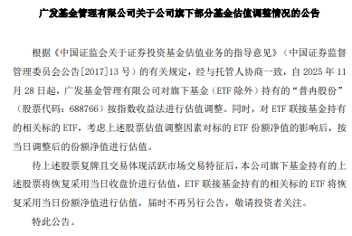 根据《中国证监会关于证券投资基金估值业务的指导意见》(中国证券监督管理委员会公告[2017]13号) 的有关规定,经与托管人协商一致,自2025年11月28日起,广发基金管理有限公司对旗下基金(ETF除 外)持有的"普冉股份"(股票代码:688766)按指数收益法进行估值调整。同时,对ETF联接基金持有的相 关标的ETF,考虑上述股票估值调整因素对标的ETF份额净值的影响后,按当日调整后的份额净值进行 估值。 中国经济网北京12月1日讯近日,广发基金管理有限公司发布关于公司旗下部分基金估值调整情况的公 告。 待上述股票复牌且交易体现活跃市场交易特征后,公司旗下基金持有的上述股票将恢复采用当日收盘价 进行估值,ETF联接基金持有的相关标的ETF将恢复采用当日份额净值进行估值,届时不再另行公告, 敬请投资者关注。 ...