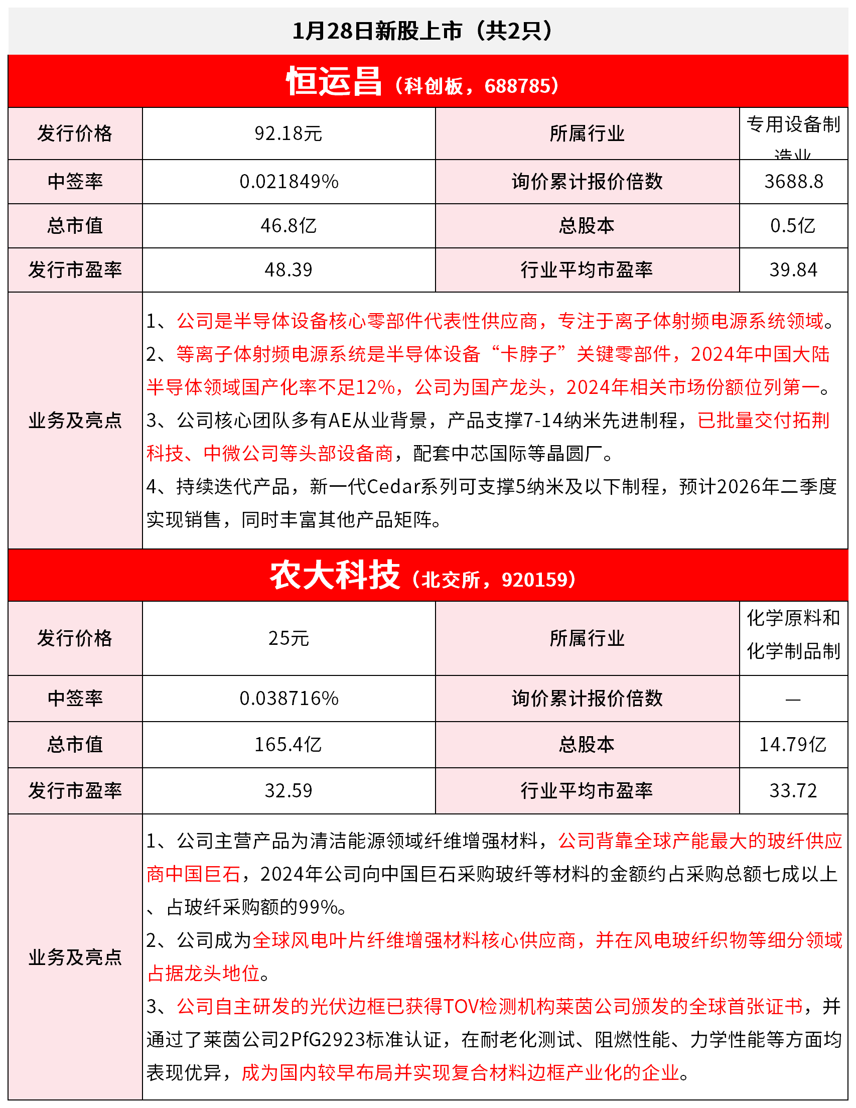 1月28日新股上市 (共2只) *免责声明:文章内容仅供参考,不构成投资建议 *风险提示:股市有风险,入市需谨慎 | | 恒运昌 (科创板, 688785 | | | --- | --- | --- | | 发行价格 | 92.18元 | | | 中签率 | 0.021849% | 询价 | | 总市值 | 46.8亿 | | | 发行市盈率 | 48.39 | 行业 | | | 半导体领域国产化率不足12%,公司为国产龙头 | | | | 公司是半导体设备核心零部件代表性供应商, 1、 2、等离子体射频电源系统是半导体设备"卡脖子 | | | 业务及亮点 | 3、公司核心团队多有AE从业背景,产品支撑7-1 | | | | 科技、中微公司等头部设备商,配套中芯国际等; | | | | 4、持续迭代产品,新一代Cedar系列可支撑5纳 | | | | 实现销售,同时丰富其他产品矩阵。 | | | | 农大科技(北交所, 92015 | | | 发行价格 | 25元 | | | 中签率 | 0.038716% | 询价 | | 总市值 | 165.4亿 | | | 发行市盈率 | 32.59 | 行业 | | ...
