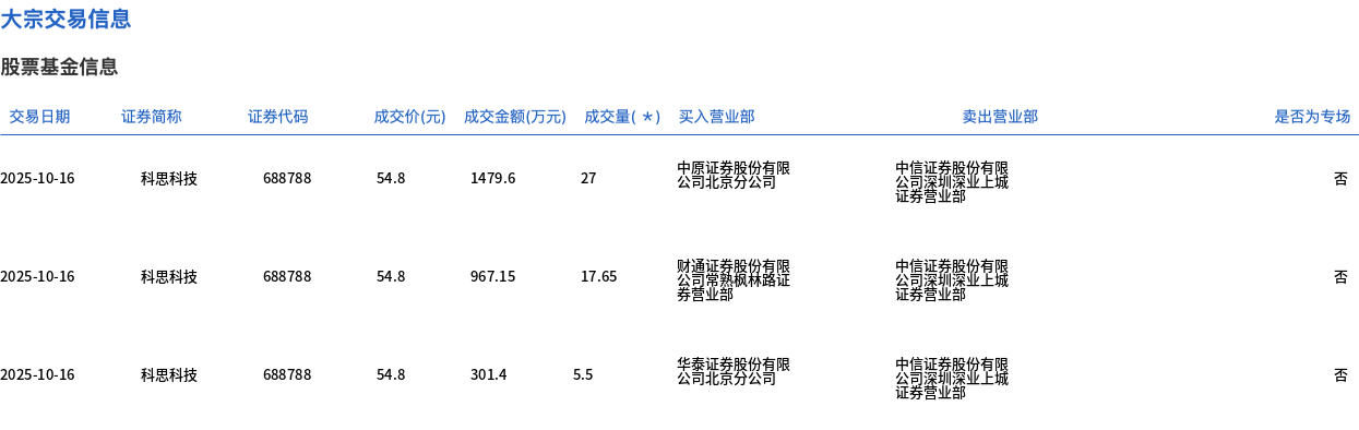 Core Insights - The article focuses on the trading activities of Kesi Technology (科思科技) on October 16, 2025, highlighting significant transactions and the involvement of various brokerage firms [1]. Trading Activities - On October 16, 2025, Kesi Technology (688788) had a trading price of 54.8 yuan, with a total transaction amount of 1479.6 million yuan and a trading volume of 27 [1]. - Another transaction on the same day recorded a transaction amount of 967.15 million yuan with a trading volume of 17.65 [1]. - A third transaction also on October 16, 2025, showed a transaction amount of 301.4 million yuan, although the trading volume was not specified [1]. Brokerage Firms Involved - The buying brokerage for the largest transaction was Zhongyuan Securities Co., Ltd. Beijing Branch [1]. - The selling brokerage for the largest transaction was CITIC Securities Co., Ltd. [1]. - Other transactions involved various brokerages, including Huatai Securities Co., Ltd. Beijing Branch and additional branches of CITIC Securities [1].