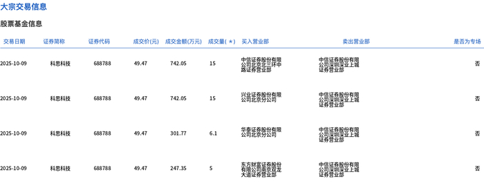 | 交易日期 | 证券調称 | 证券代码 | | | 成交价(元) 成交金额(万元) 成交量(*) 买入营业部 | | 类出营业部 | 是否为专场 | | --- | --- | --- | --- | --- | --- | --- | --- | --- | | 2025-10-09 | 科思科技 | 688788 | 49.47 | 742.05 | 15 | | 2017 2017 11:25 11 | 图 | | 2025-10-09 | 科思科技 | 688788 | 49.47 | 742.05 | 15 | 兴业证券股份有限 | SHERE SERSED | KO | | 2025-10-09 | 科思科技 | 688788 | 49.47 | 301.77 | 6.1 | 华泰证券股份有限 公司北京分公司 | 容量度的模式及基礎 | 185 | | 2025-10-09 | 科里科技 | 688788 | 49.47 | 247.35 | દે | 類 | 去自量有量发生型 | Ka | 10月9日,科思科技大宗交易成交41.1万股,成交额2033.22万元,占当日总成交额的7.69%,成交 ...