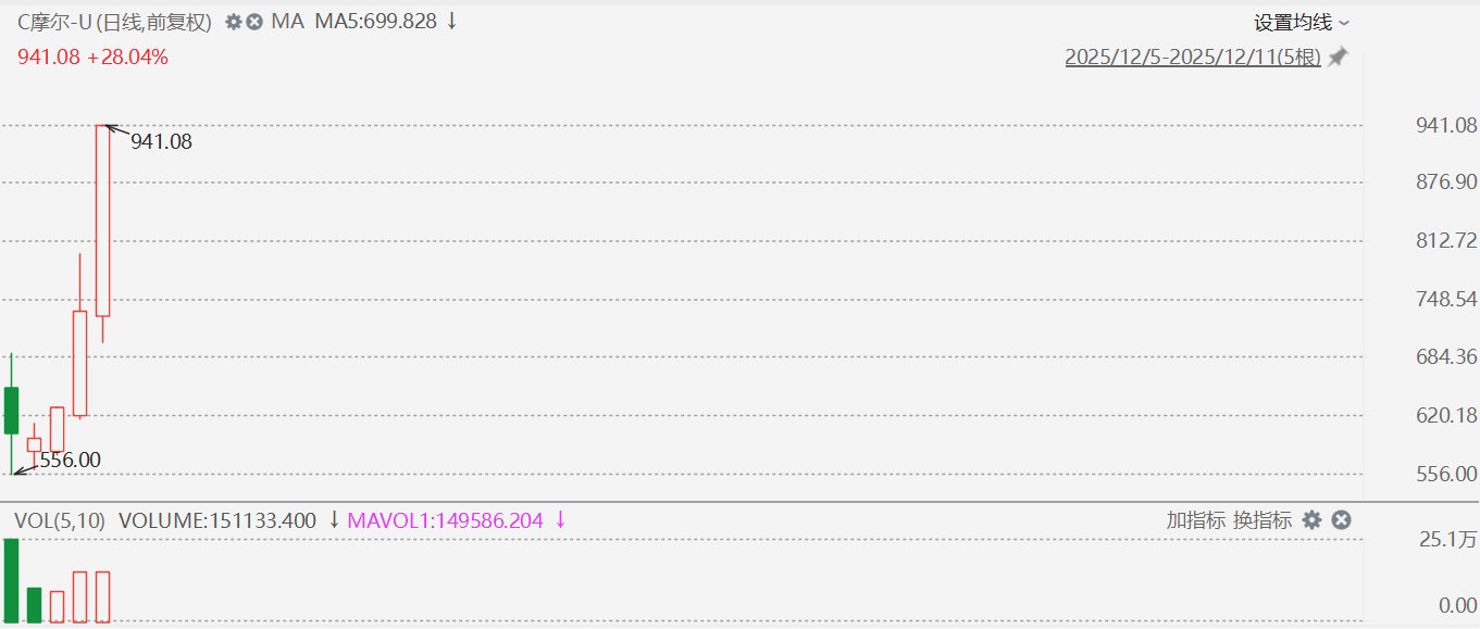 今日(12月11日)午后,摩尔线程股价进一步走高,盘中股价突破900元。截至收盘,摩尔线程股价报941.08元/股,涨幅为28.04%,再度刷新历史高点。如 果投资者中签摩尔线程新股且能持有至今,按收盘价计算,单签浮盈将超过40万元。不过,数据显示,由于摩尔线程上市后换手率一直较高,中签后能一 直持有至今的投资者或极少。 摩尔线程发行价为114.28元。行情数据显示,摩尔线程上市以来受到市场强烈追捧,股价连续上涨,上市首日股价即突破600元,当天收盘大涨425.46%; 上市第二个交易日摩尔线程股价微跌1.04%;周二(上市第三日)开始,摩尔线程股价开启连续上涨:周二摩尔线程上涨5.73%;周三涨势进一步加速,股价 突破700元,当天收盘大涨16.98%;今天上午,摩尔线程股价突破800元,下午再突破900元,涨幅超过28%。 摩尔线程被市场视为"国产GPU第一股",其上市以来被市场追捧或与今年以来国产GPU概念大热有关。 根据招股资料,摩尔线程已成功推出四代GPU架构,并形成了覆盖AI智算、高性能计算、图形渲染、计算虚拟化、智能媒体和面向个人娱乐与生产力工 具等应用领域的多元计算加速产品矩阵,产品线涵盖政务 ...