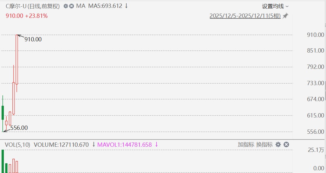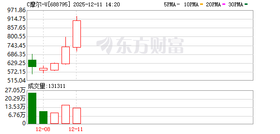 | C摩尔-U(日线,前复权) * 3 MA MA5:693.612 ↓ | 设置均线。 | | | --- | --- | --- | | 910.00 +23.81% | 2025/12/5-2025/12/11(5根) ★ | | | 910.00 | | 910.00 | | | | 851.00 | | | | 792.00 | | | | 733.00 | | | | 674.00 | | | | 615.00 | | 556.00 | | 556.00 | | VOL(5,10) VOLUME:127110.670 ↓ MAVOL1:144781.658 ↓ | 加指标 换指标 * 8 | 25.1万 | | | | 0.00 | MACD金叉信号形成,这些股涨势不错! 格隆汇12月11日|摩尔线程-U(688795.SH)上市第五日,股价突破900元,位居A股第三,仅次于贵州茅台与寒武纪,总市值突破4200亿元。 ...