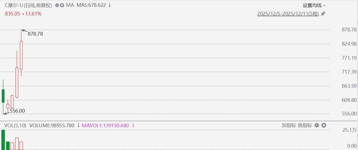 格隆汇12月11日|次新股摩尔线程(688795.SH)继续走强,今日盘中再度拉升,一度涨近20%,报878.78 元,再创历史新高,市值一度超4100亿元。该股IPO定价为114.28元,今日盘中最高价较IPO价累涨 669%,较首日上市开盘价650元,累涨超35%。 | C摩尔-U (日线,前复权) * © MA MA5:678.622 ↓ | 设置均线。 | | | --- | --- | --- | | 835.05 + 13.61% | 2025/12/5-2025/12/11(5根) ★ | | | 878.78 | | 878.78 | | ********* | | 824.98 | | REERRERES | | 771.19 | | | | 717.39 | | | | 663.59 | | | | 609.80 | | 6.00 | | 556.00 | | VOL(5,10) VOLUME:98955.780 ↓ MAVOL1:139150.680 ↓ | 加指标 换指标 * 8 | 25.1万 | | | | 0.00 | ...