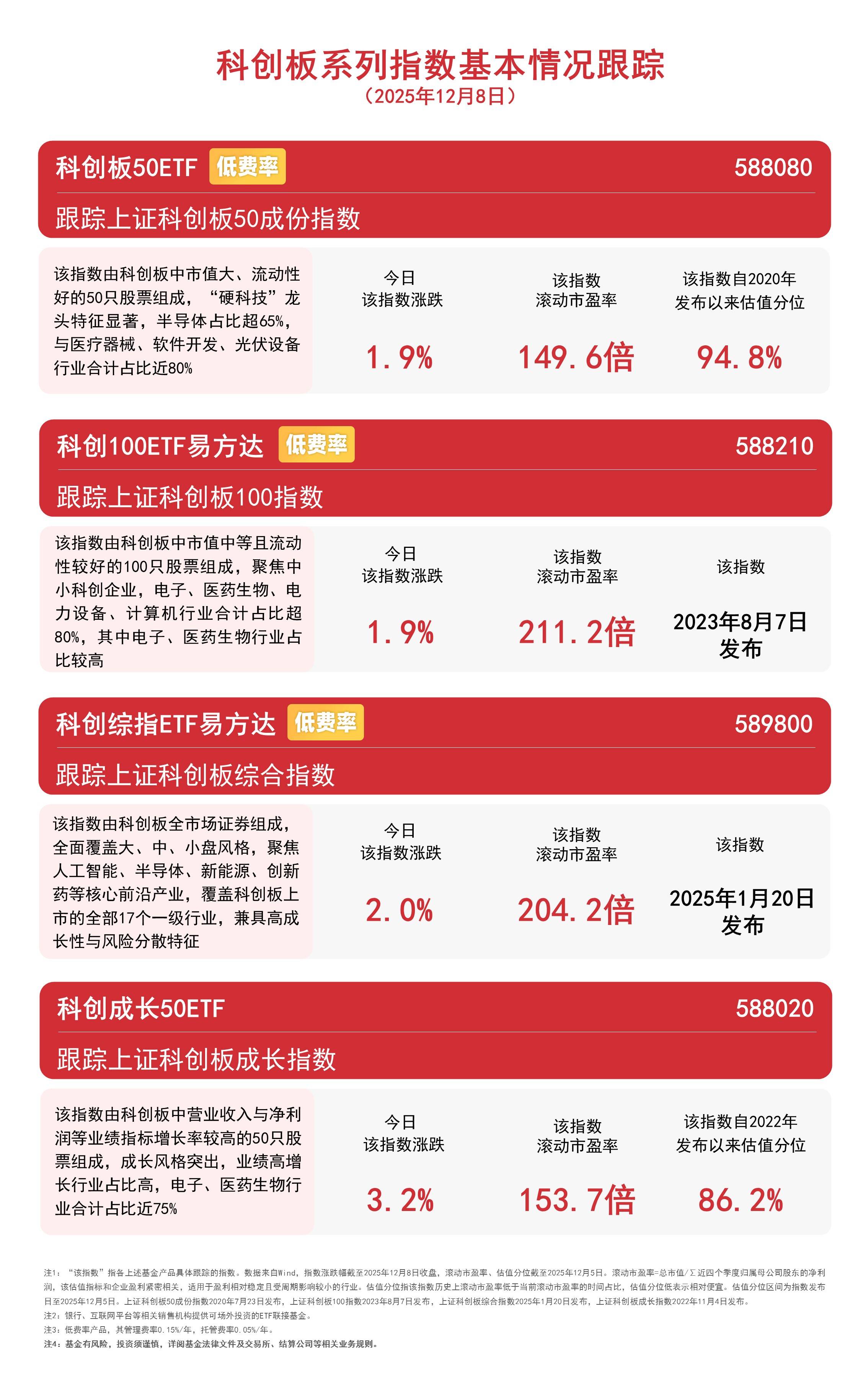 截至收盘,科创成长指数上涨3.2%,科创绿指上涨2.0%,科创板50指数、科创100指数均上涨1.9%,盘面上,算力硬件概念爆发,瑞可达20%张停 电涨超18%,长光华芯涨超15%,AI应用板块局部活跃,开普云涨超13%,慧辰股份涨超10%,品高股份涨超6%。 科创板系列指 (2025: 科创板50ETF 低费率 跟踪上证科创板50成份指数 该指数由科创板中市值大、流动性 好的50只股票组成,"硬科技"龙 头特征显著,半导体占比超65%, 与医疗器械、软件开发、光伏设备 行业合计占比近80% �日 该指数污 1. 保丰 年 83 科创100ETF易方达 跟踪上证科创板100指数 该指数由科创板中市值中等且流动 性较好的100只股票组成,聚焦中 .1. TV Ail A. II. 令日 该指数污 小科创企业,电于、医约王彻、电 力设备、计算机行业合计占比超 80%,其中电子、医药生物行业占 比较高 该指数由科创板中营业收入与净利 润等业绩指标增长率较高的50只股 票组成,成长风格突出,业绩高增 长行业占比高,电子、医药生物行 令日 该指数污 1.9 科创综指ETF易方达 低费率 跟踪上证科创板综合指数 该指数由 ...